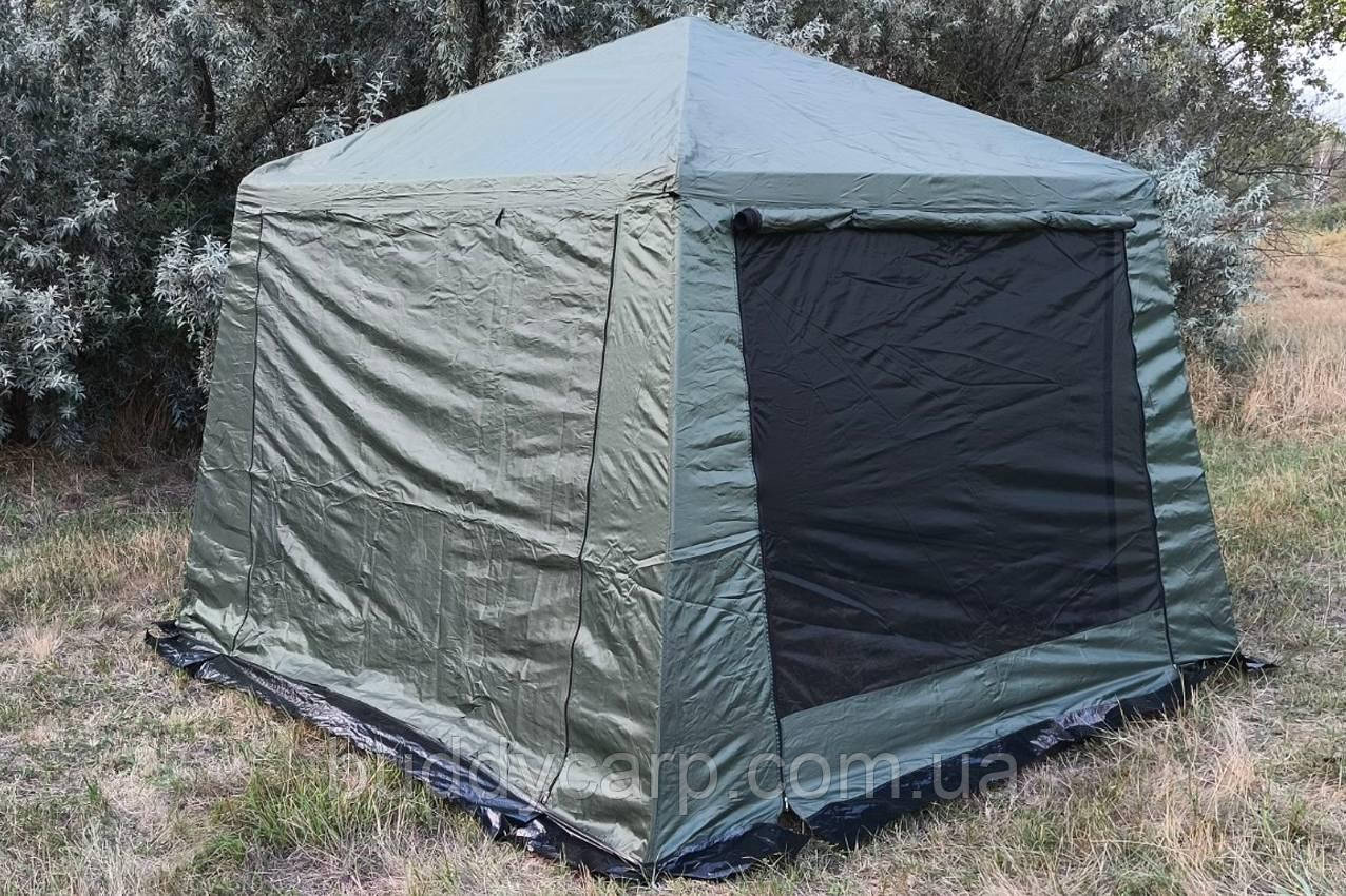 Намет-Альтанка з металевим каркасом, двома входами, з чотирма великими вікнами з москітною сіткою, чохол, кілочки та штормові мотузочки в комплекті. Намет великий просторий добре продувається в спекотну погоду, комфортне перебування за будь-яких погодних умов, будь то дощ або пекуче сонце. Намет універсальний підходить для риболовлі, полювання, відпочинку на природі, саду чи дачі.